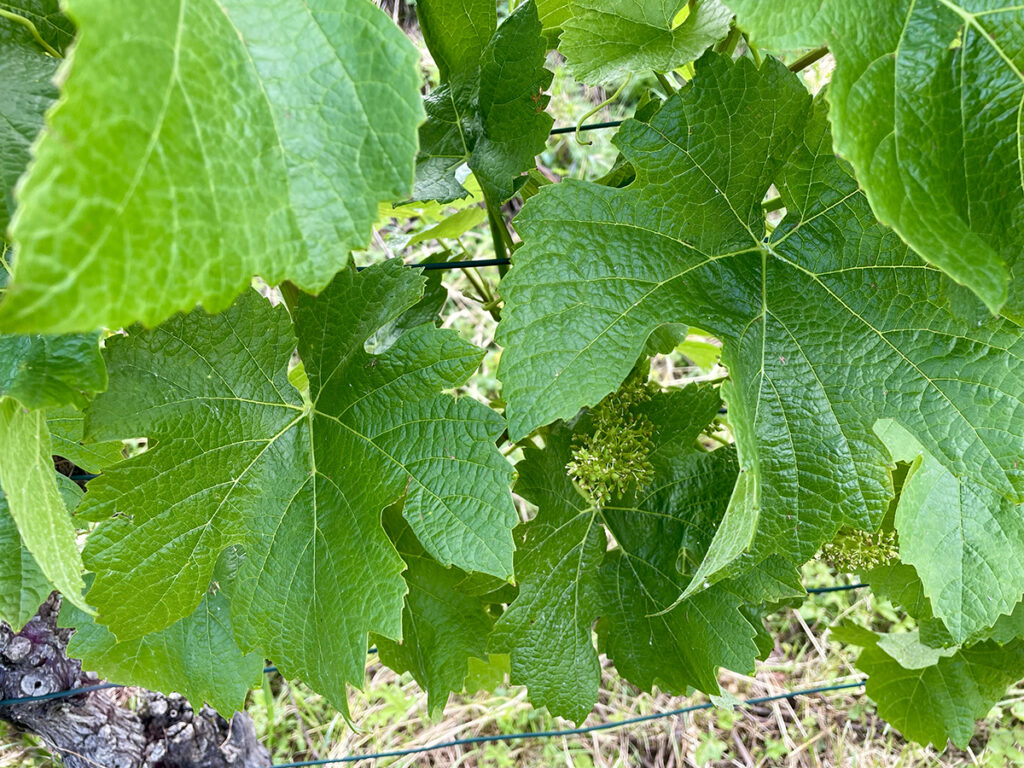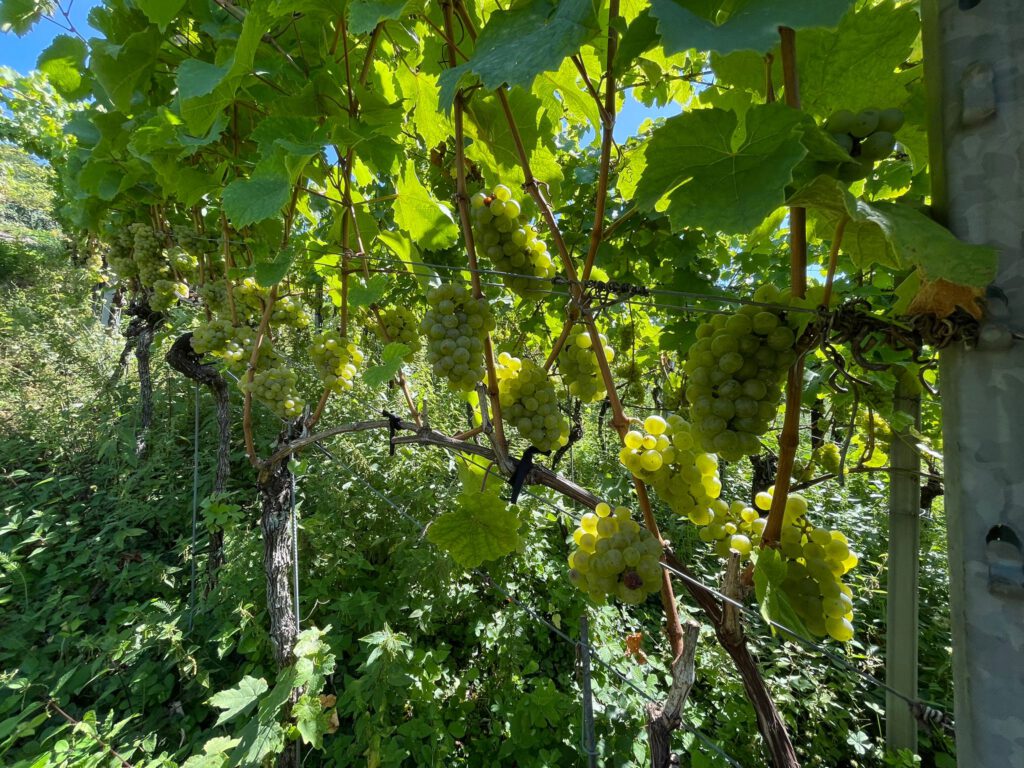 Ich versuche so natürlich wie möglich mit der Rebe zu interagieren und auf ihre Bedürfnisse einzugehen. So habe ich die Methode des Wickelns und des Tunnels etabliert. Dabei werden die Triebspitzen über der Reihe miteinander verbunden und gewickelt. In den nächsten Tagen verbinden sie sich dann über ihre ranken und bilden ein stabiles Dach über der Rebzeile, das dazu noch Schatten im Weingarten spendet. So umgehe ich den rabiaten Eingriff des abschneidens der Triebspitze, welche die Rebe auf unnatürliche Weise aus dem vegetativen ins generative Stadium zwingt.